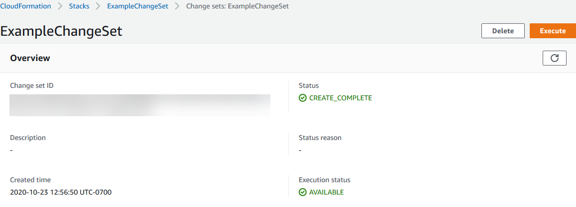aws cloudformation execute-change-set命令。指定您要执行的更改集的更改集 ID,如下例中所示: