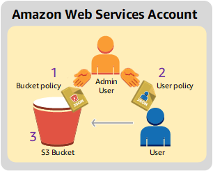 因为存储桶拥有者和用户所属的父账户相同,所以 Amazon Web Services 账户可以使用存储桶策略和/或用户策略向用户授予权限。在此示例中,您同时使用这两种方法。如果对象也由同一个账户拥有,则存储桶拥有者可以在存储桶策略《或 IAM policy)中授予对象权限。