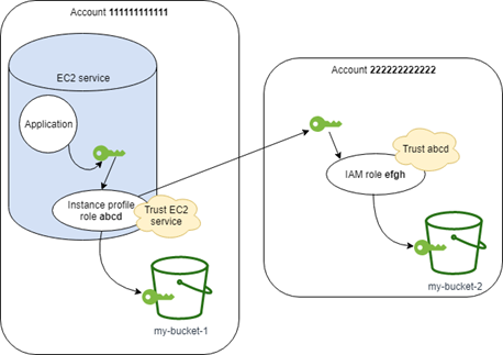 假设您使用两个 Amazon Web Services 账户,并希望允许 Amazon EC2 实例上运行的应用程序在两个账户中运行 Amazon CLI111111111111 账户中。该实例包含 abcd 实例配置文件角色,以允许应用程序对同一 111111111111 账户中的 my-bucket-1 存储桶执行只读 Amazon S3 任务。不过,还必须允许应用程序担任 efgh 跨账户角色以访问 222222222222 账户中的 my-bucket-2 Amazon S3 存储桶。