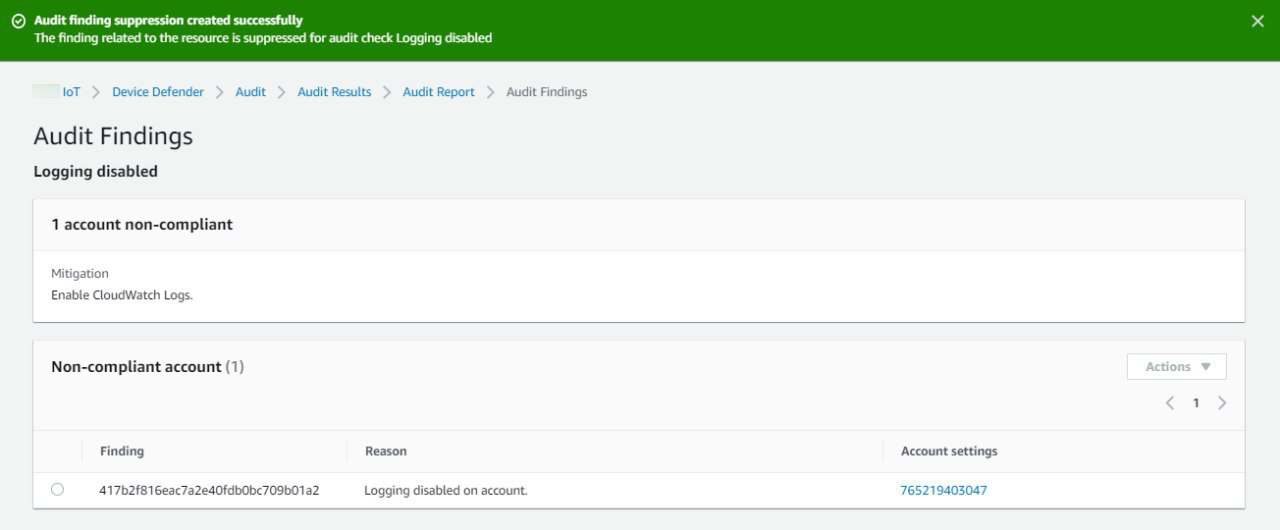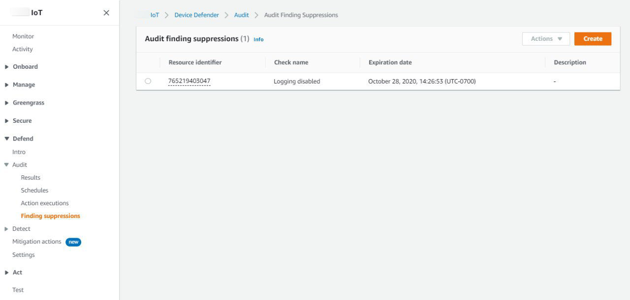 以下流程介绍了如何在 Amazon IoT 控制台中创建审计查找结果隐藏。