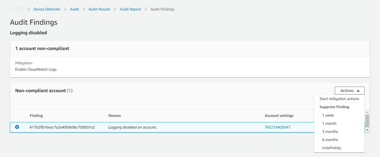 在审计检查详细信息屏幕上,如果存在您不想看到的查找结果,请选择查找结果旁边的选项按钮。然后,选择 Actions(操作),接着选择您希望审计查找结果隐藏持续的时长。