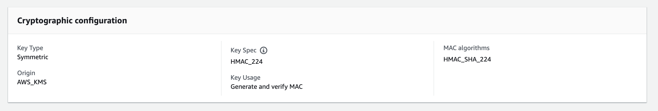 在 HMAC KMS 密钥的 key details(密钥详细信息)页面中,您可以在 Cryptographic configuration(加密配置)选项卡上找到其配置详细信息。