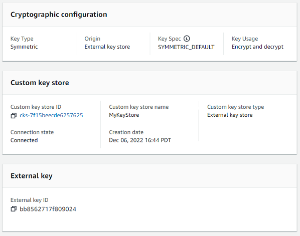 $aws kms describe-key --key-id1234abcd-12ab-34cd-56ef-1234567890ab{ "KeyMetadata": { "Arn": "arn:aws:kms:us-west-2:111122223333:key/1234abcd-12ab-34cd-56ef-1234567890ab", "AWSAccountId": "111122223333", "CreationDate": "2022-12-02T07:48:55-07:00", "CustomerMasterKeySpec": "SYMMETRIC_DEFAULT", "CustomKeyStoreId": "cks-1234567890abcdef0", "Description": "", "Enabled": true, "EncryptionAlgorithms": [ "SYMMETRIC_DEFAULT" ], "KeyId": "1234abcd-12ab-34cd-56ef-1234567890ab", "KeyManager": "CUSTOMER", "KeySpec": "SYMMETRIC_DEFAULT", "KeyState": "Enabled", "KeyUsage": "ENCRYPT_DECRYPT", "MultiRegion": false, "Origin": "EXTERNAL_KEY_STORE", "XksKeyConfiguration": { "Id": "bb8562717f809024" } } }